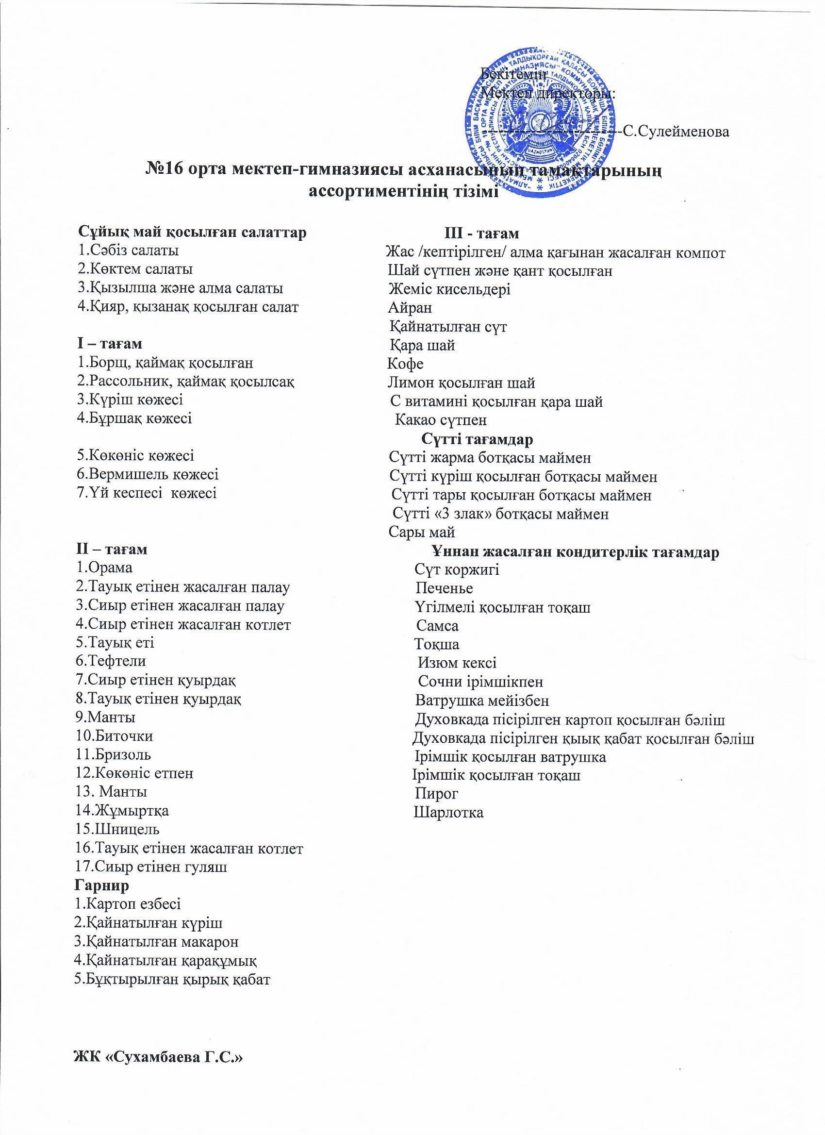 Асхана тамақтарының ассортиментінің тізімі » №16 орта мектеп-гимназия. Талдықорған