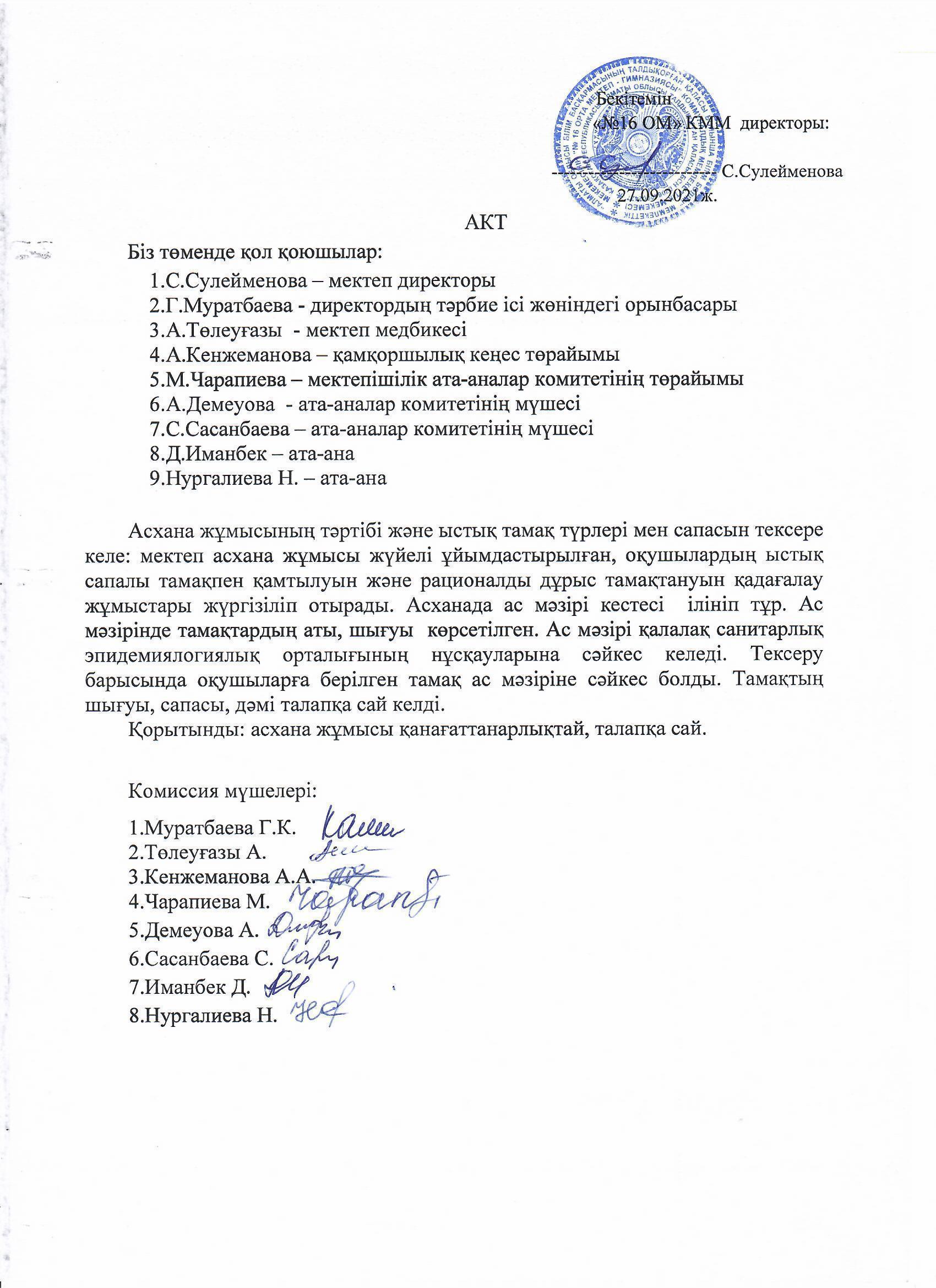 Асхана жұмысын тексеру актісі » №16 орта мектеп-гимназия. Талдықорған