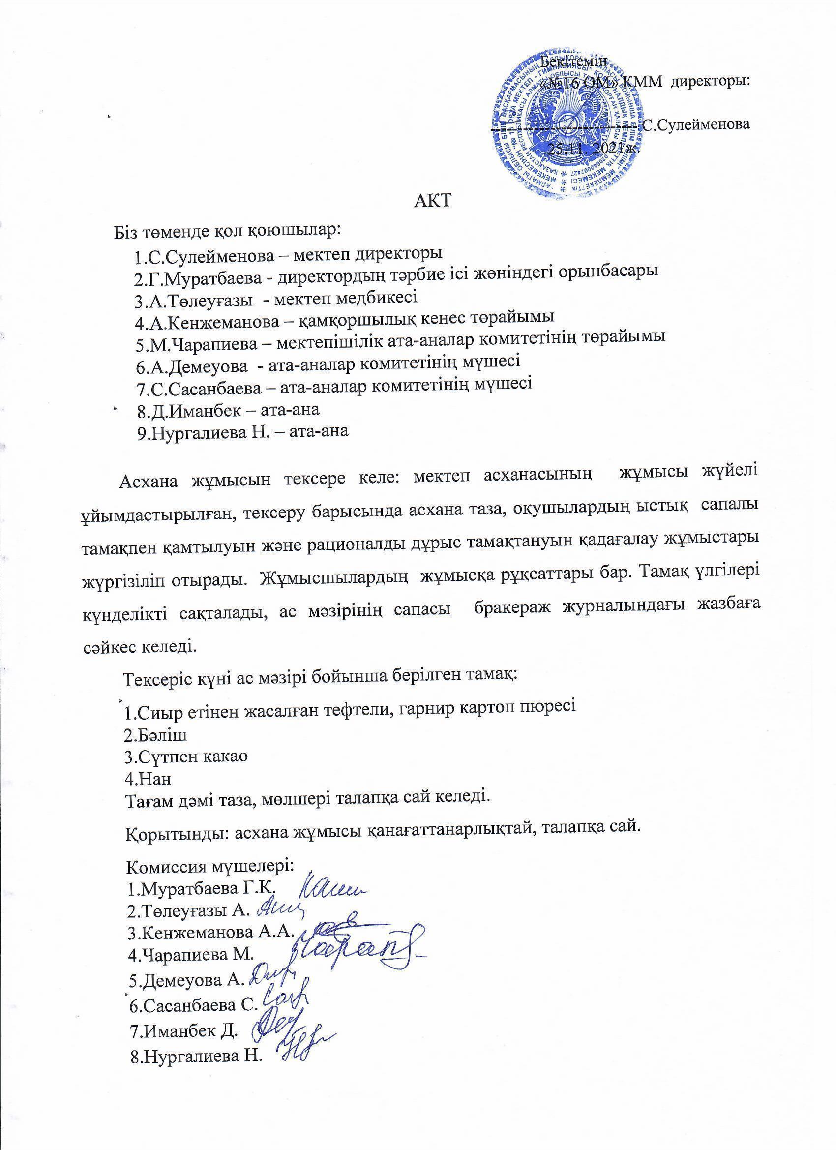 Асхана жұмысын тектеру актісі » №16 орта мектеп-гимназия. Талдықорған