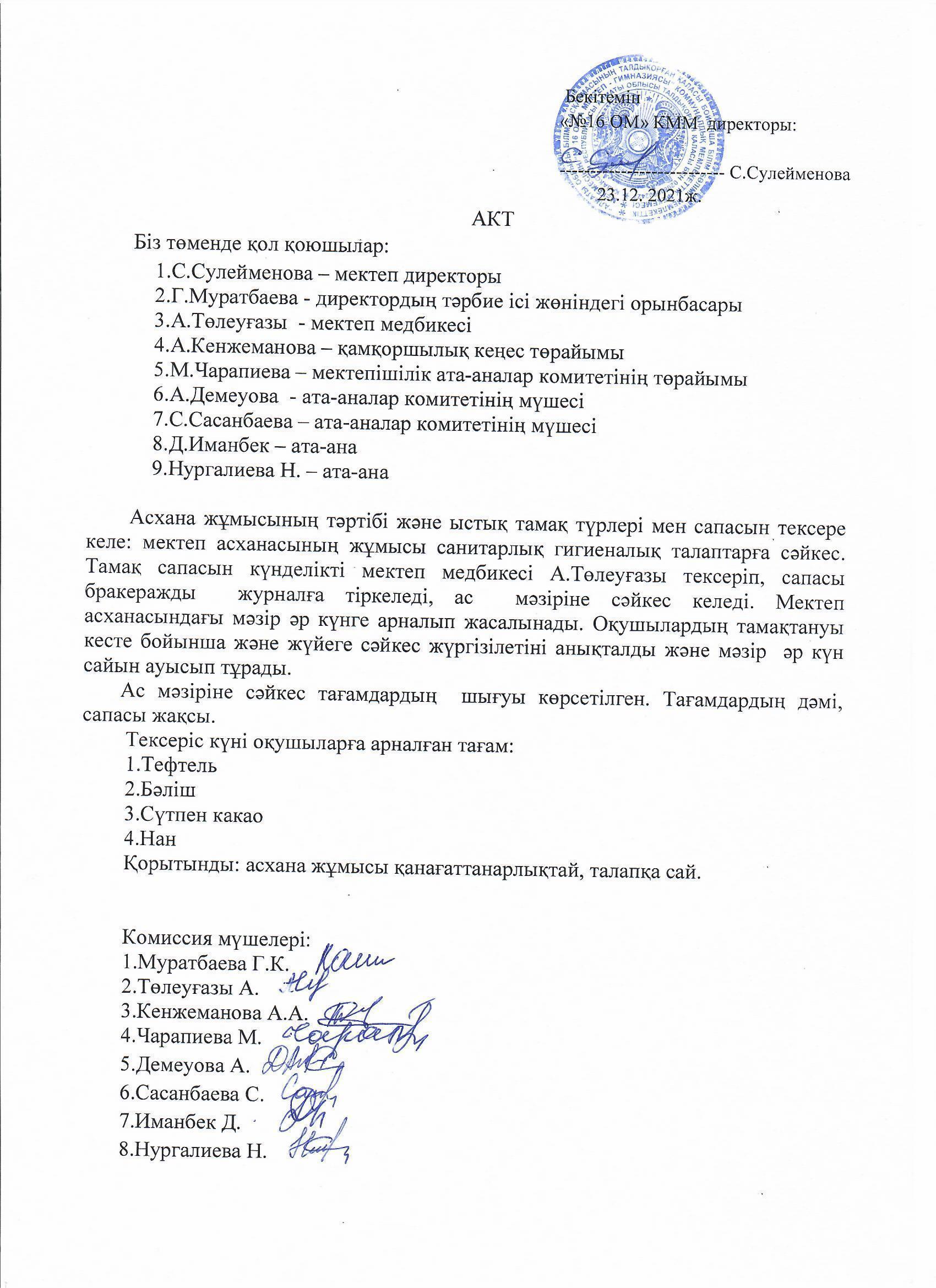 Асхана жұмысын тектеру актісі » №16 орта мектеп-гимназия. Талдықорған