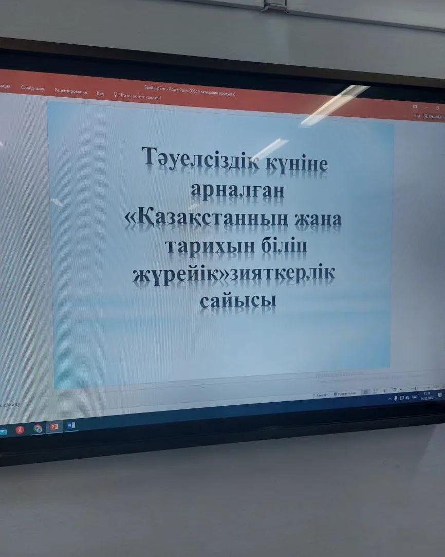 16 орта мектеп-гимназиясының 8-9 сынып оқушылары арасында Тәуелсіздік күні мерекесіне орай "Қазақстанның тарихын біліп жүрейік" атты зияткерлік сайысы өтті.Тартымды шараға жасөспірімдер белсене қатысты.Тартысты бәсекеде 10:8 есебімен 9-сынып оқушылары жеңіске жетті